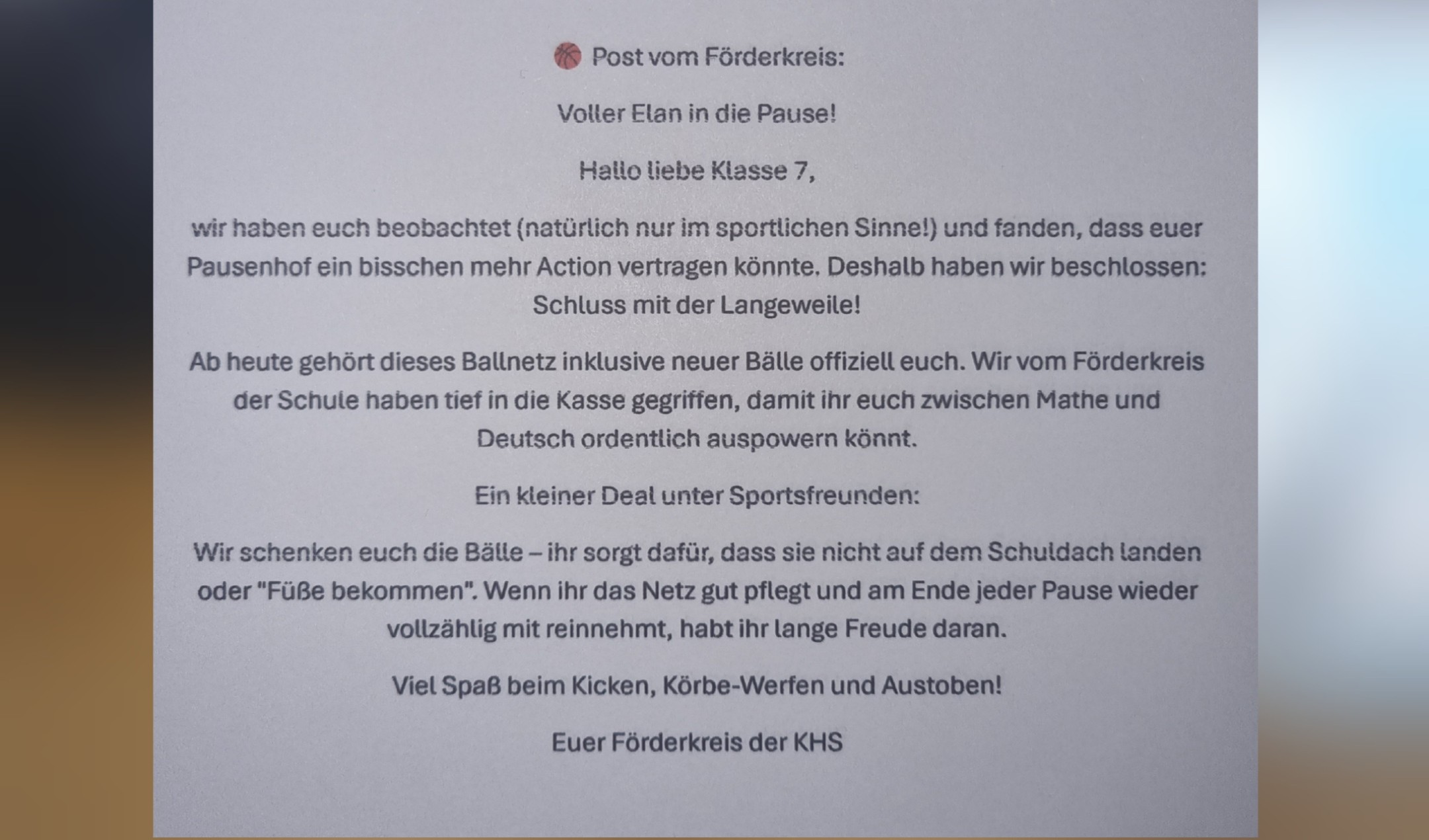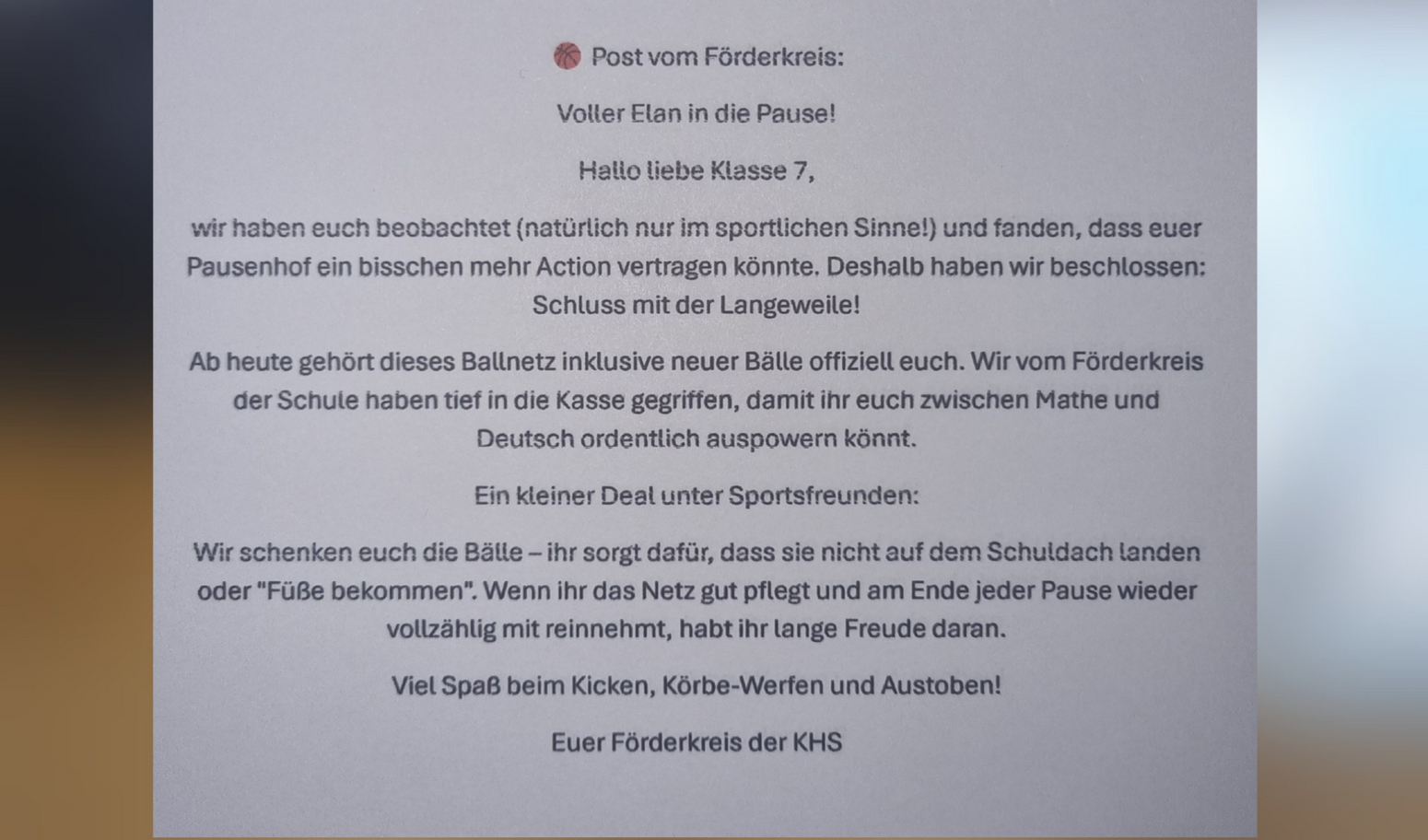 Wir freuen uns sehr, heute ein tolles Projekt aus dem Bereich der „Aktiven Pause" an der Klaus-Harms-Schule vorstellen zu dürfen: Der Förderkreis hat pünktlich zum Start der wärmeren Jahreszeit einen kompletten Satz neuer Sportbälle für die Schülerinnen und Schüler der 7. Jahrgangsstufe gespendet!